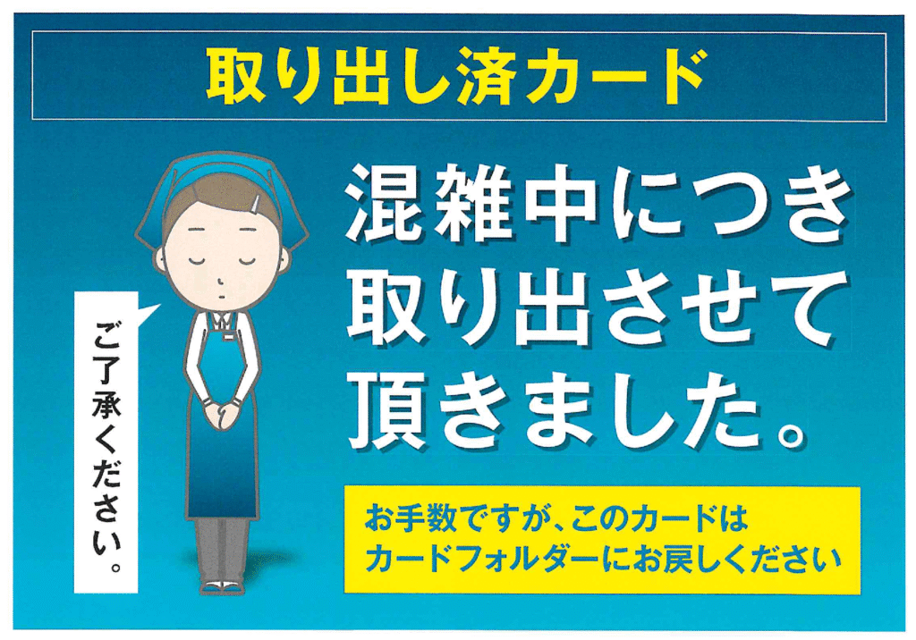 その様な時は、大変お手数ですが洗濯物をカートもしくは忘れ物棚にお出し頂き、店内に置いてあります「取り出し済カード」を載せ、ご利用ください。