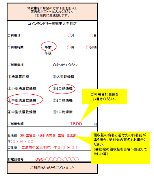 店内両替機の上に置いてある領収証申し込み用紙に下記の例を元に記入し、両替機の上のポストに投函ください。