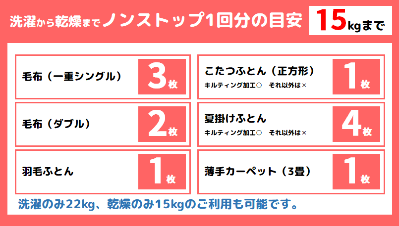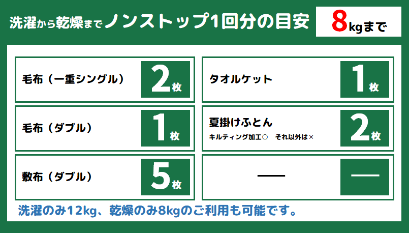 下記は目安です。実際に洗濯物を入れていただき、ドアのガラス面に表示されてます「少量コース」「標準コース」のラインも参考にしてください。パンパンに詰め込みますと、洗濯能力及び乾燥能力が悪くなりますのでご注意ください。